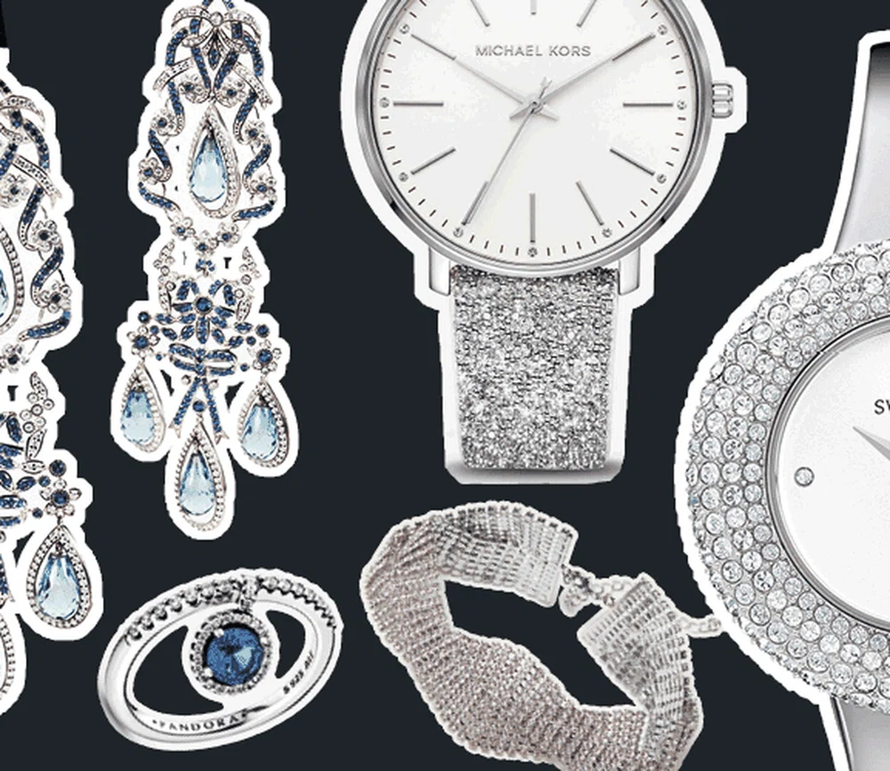 (Left to Right) Sterling silver and crystal earrings, $1,199, Ralph Lauren Collection; Rhodium-plated brooch, $279, Swarovski; Stainless steel watch, $649, Swarovski; Leather and stainless steel watch with Swarovski crystals, $449, Michael Kors