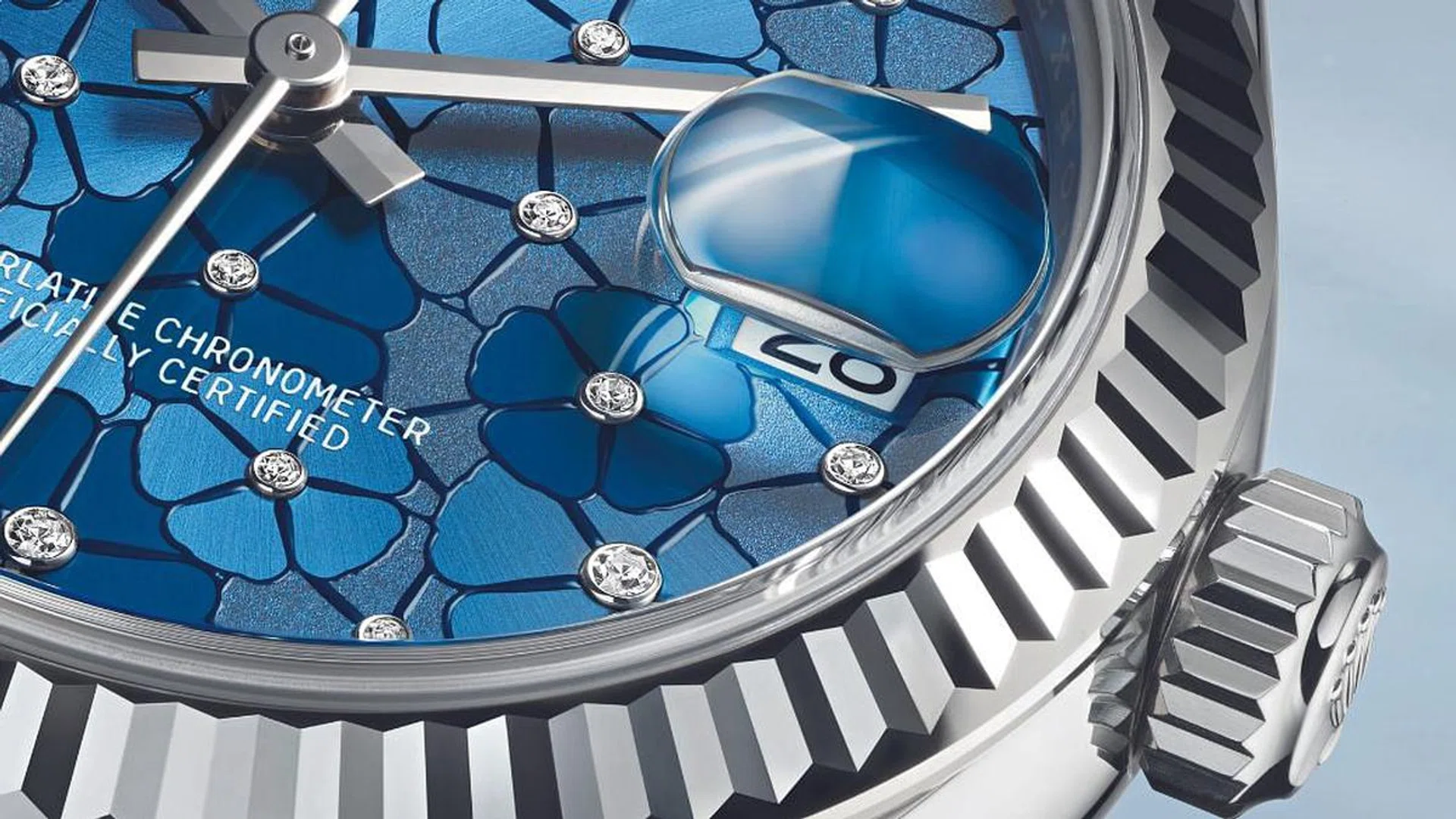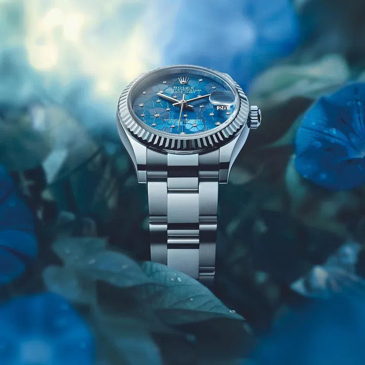 Framed by a fluted white gold bezel, with 24 flowers set with diamonds in the centre, the floral motif dial of the Rolex Oyster Perpetual Datejust 31 is an Azzurro-Blue wonder that is hard to ignore.