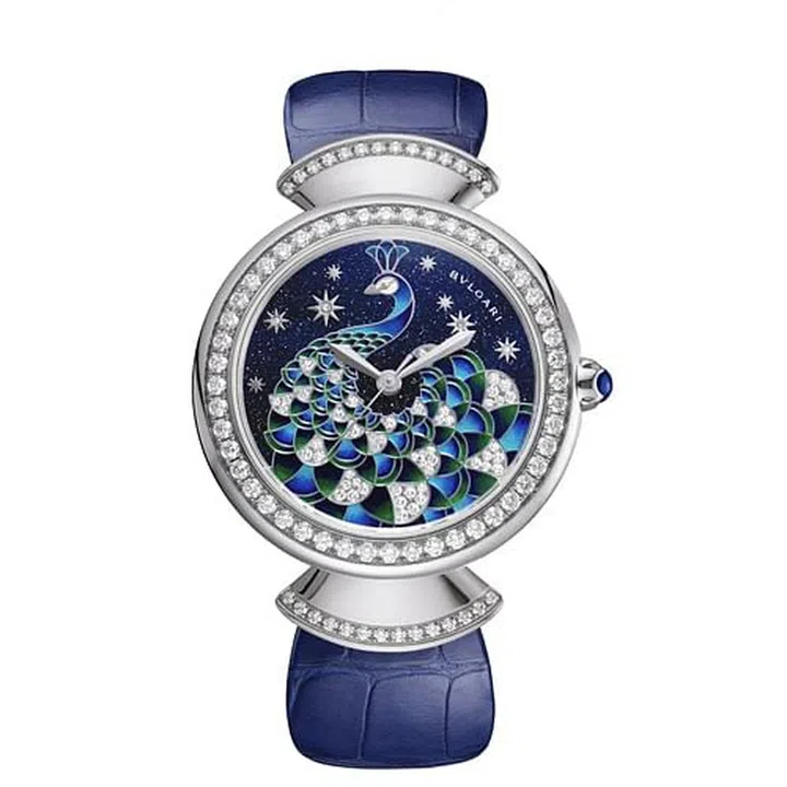 Looking as if it is straight out of a fairytale, Bulgari’s Divas’ Dream watch celebrates the luxury brand’s love for beautiful birds with a stunningly decorated dial that features a hand-painted peacock looking majestic against an aventurine dial backdrop of stars and constellations with brilliant-cut diamonds. With unique fan-shaped links and an opulent dark blue alligator strap, this watch is fitted with an 18k white gold case and bezel set with diamonds. A precious keepsake that every collector will dream of owning, this beautiful masterpiece is meant to be treasured for years to come.