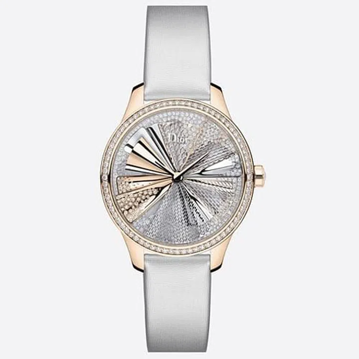 Dior’s Grand Soir Plissé Précieux watch is a masterpiece defined by its many intricate details. Showcasing a brushed white gold dial with a gradient snow setting of diamonds, and a play on different materials and dimension, the timepiece is adorned with delicate layers of metal carved to pleats or netted meshing – a nod to the brand’s artful relationship with couture and romantic tulle dresses. Featuring a 36mm pink gold case and bezel set with baguette-cut diamonds, this watch is finished with a grey satin strap and an extra black alligator strap.