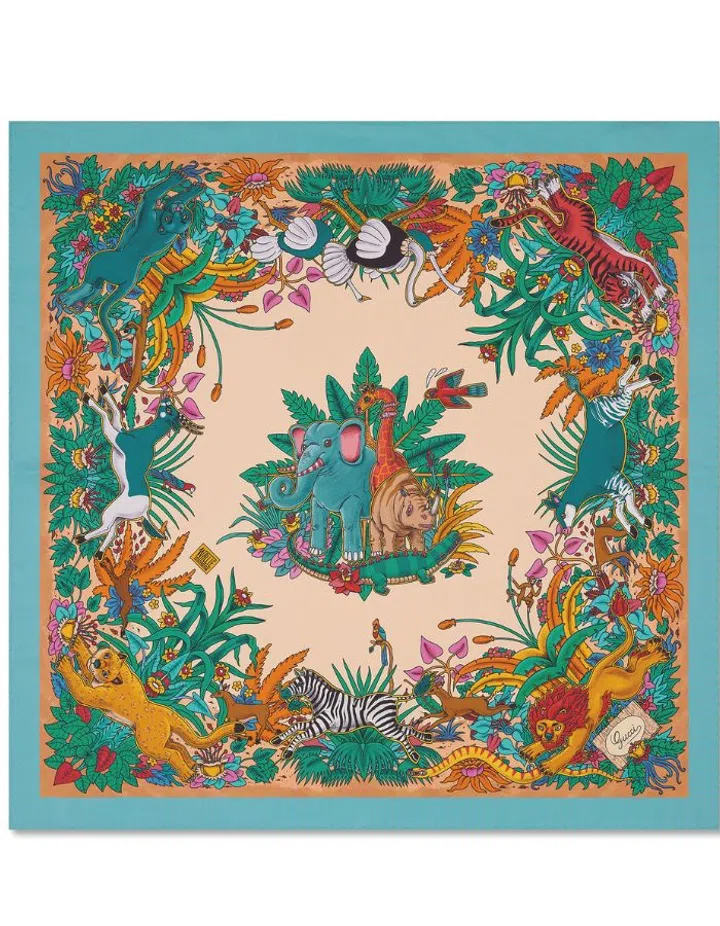 Gucci partnered with a distinguished silk producer from Como, Italy in 1958 to create the first collaborative scarf, Tolda di Nave — a nautical-themed masterpiece. This year the brand is celebrating The Art of Silk campaign, with a multi-faceted initiative celebrating Gucci’s rich history in silk craftsmanship and its forward-thinking artistic innovation. It includes the 90 x 90 project, where nine international artists reinterpret five archival themes rooted in Gucci’s storied archive — flora, fauna, nautical, equestrian, and the GG Monogram.