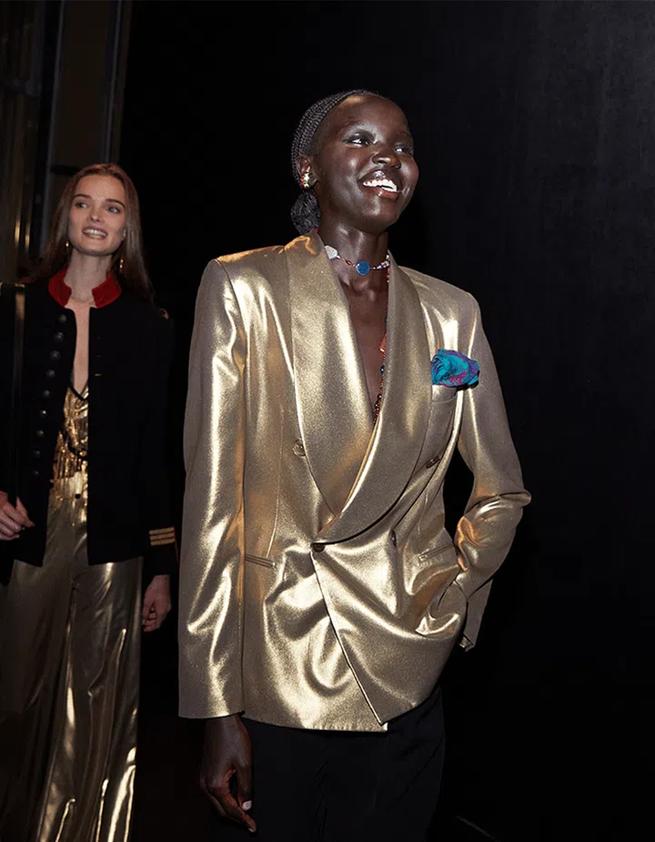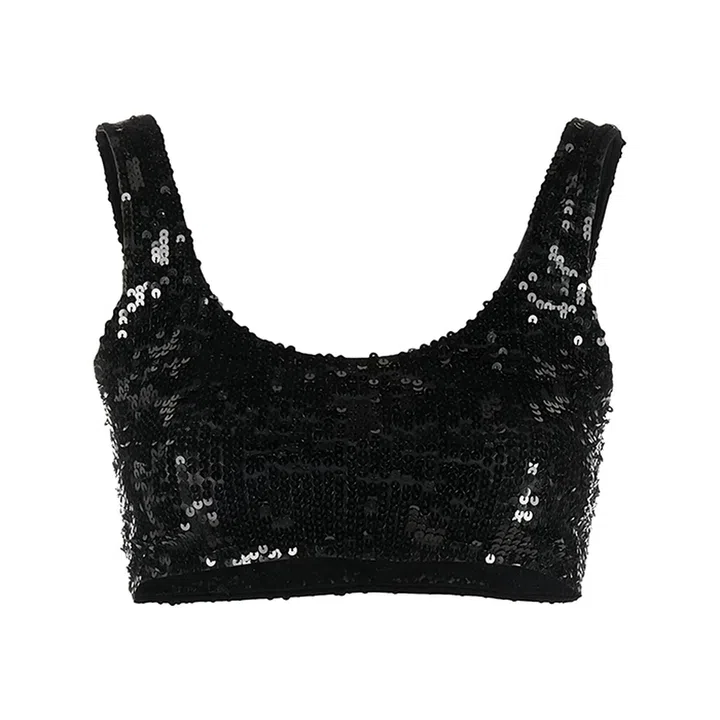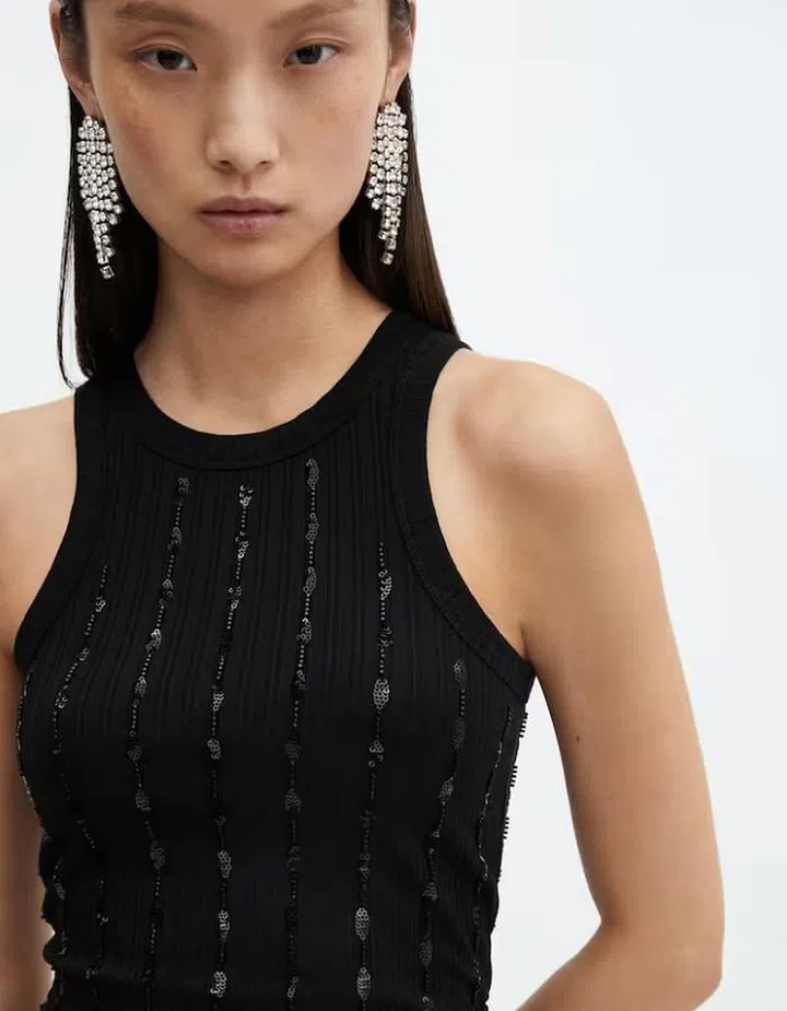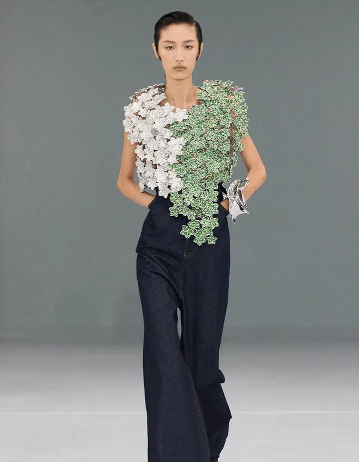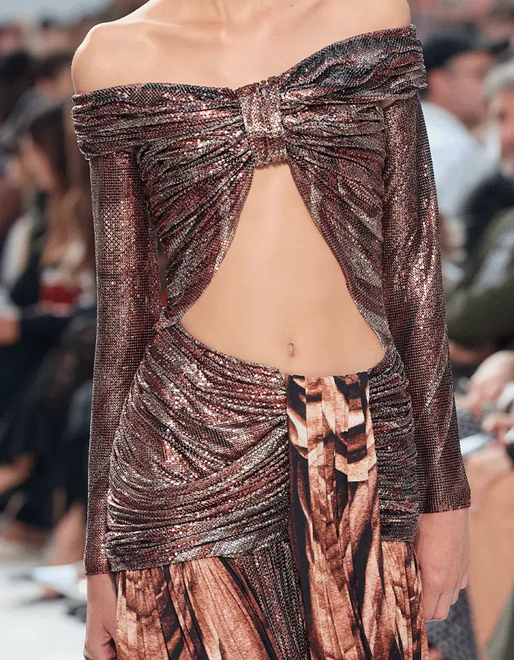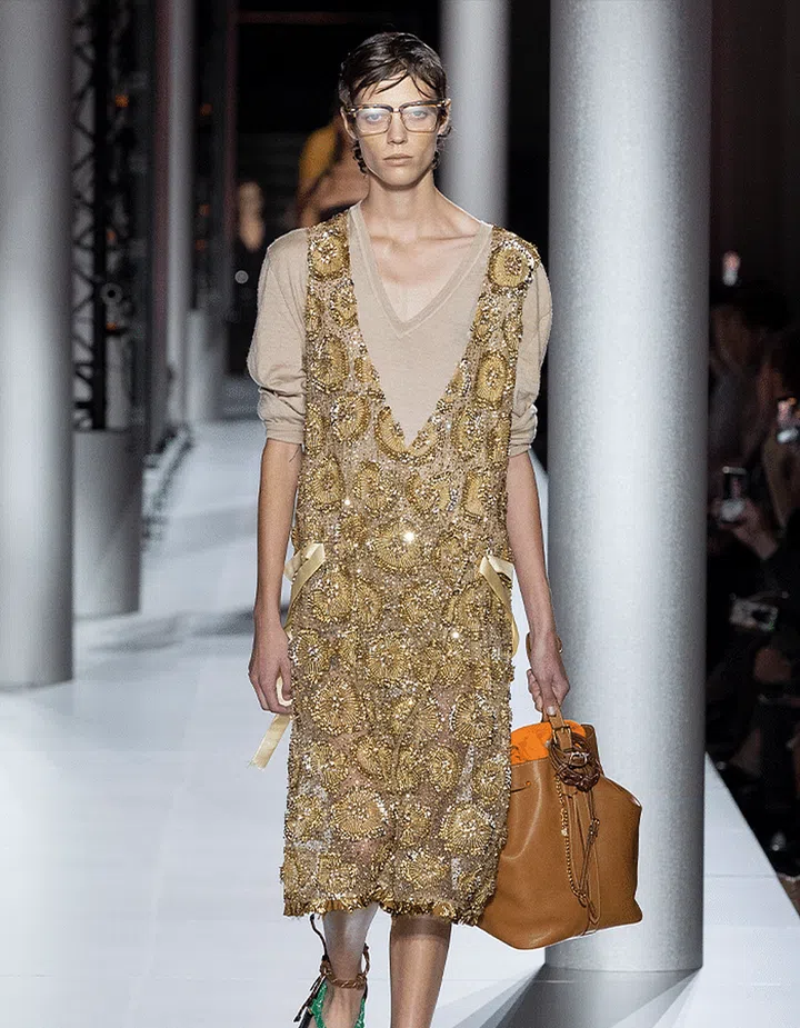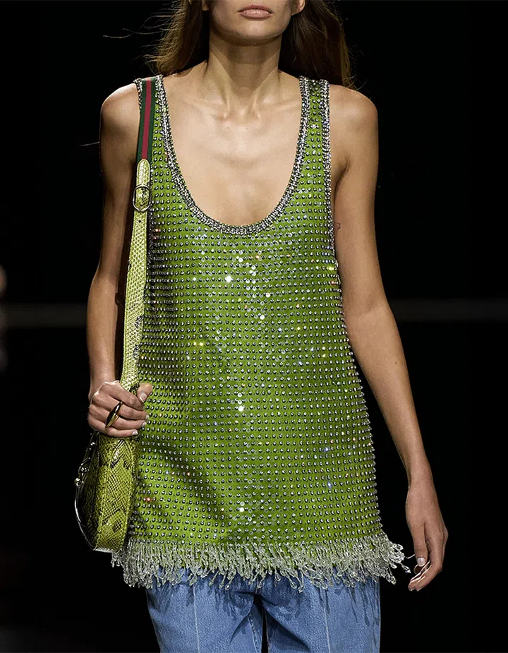 Metallics, sequins and embellished pieces take centre stage this season. Designers showcase their creativity with these glitzy materials, envisioning pieces that are equally fitting for a resort island getaway or a fancy cocktail event. Standout pieces include a luxurious gold mini dress from Miu Miu and a sequined cropped top from Rabanne.