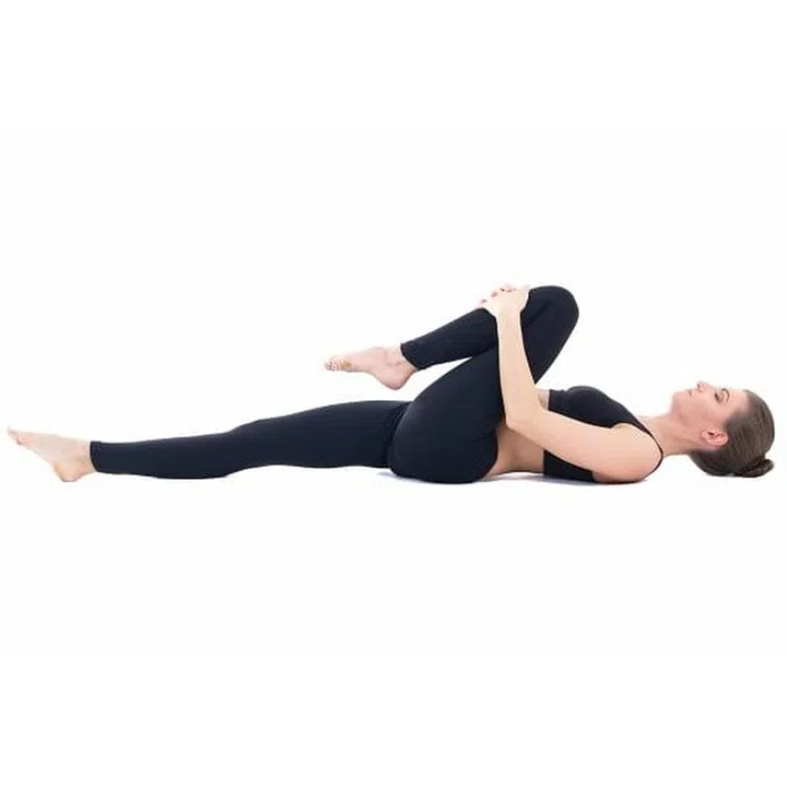 How to: lie on your back with your feet together and arms resting on the sides. Breathe in, then exhale as you bring your right knee in towards your chest. Clasp your hands around your knee and pull your thigh towards your stomach. If you can, lift your head and chest off the ground and try to touch your knee with your chin. Loosen your hands and let your leg return to the straight position, and repeat on the other side.
