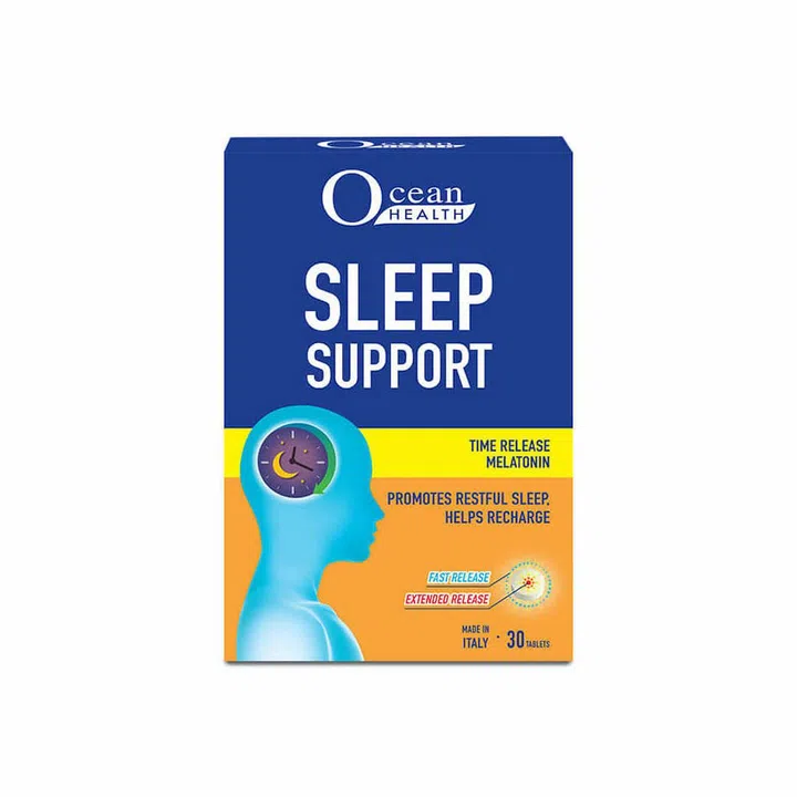 Ocean Health Sleep Support has 30 tablets, each containing 5mg of melatonin, a hormone that regulates your sleep-wake cycle. The melatonin is delivered in a patented technology that helps reduce the time taken to fall asleep as well as prolong restful sleep.