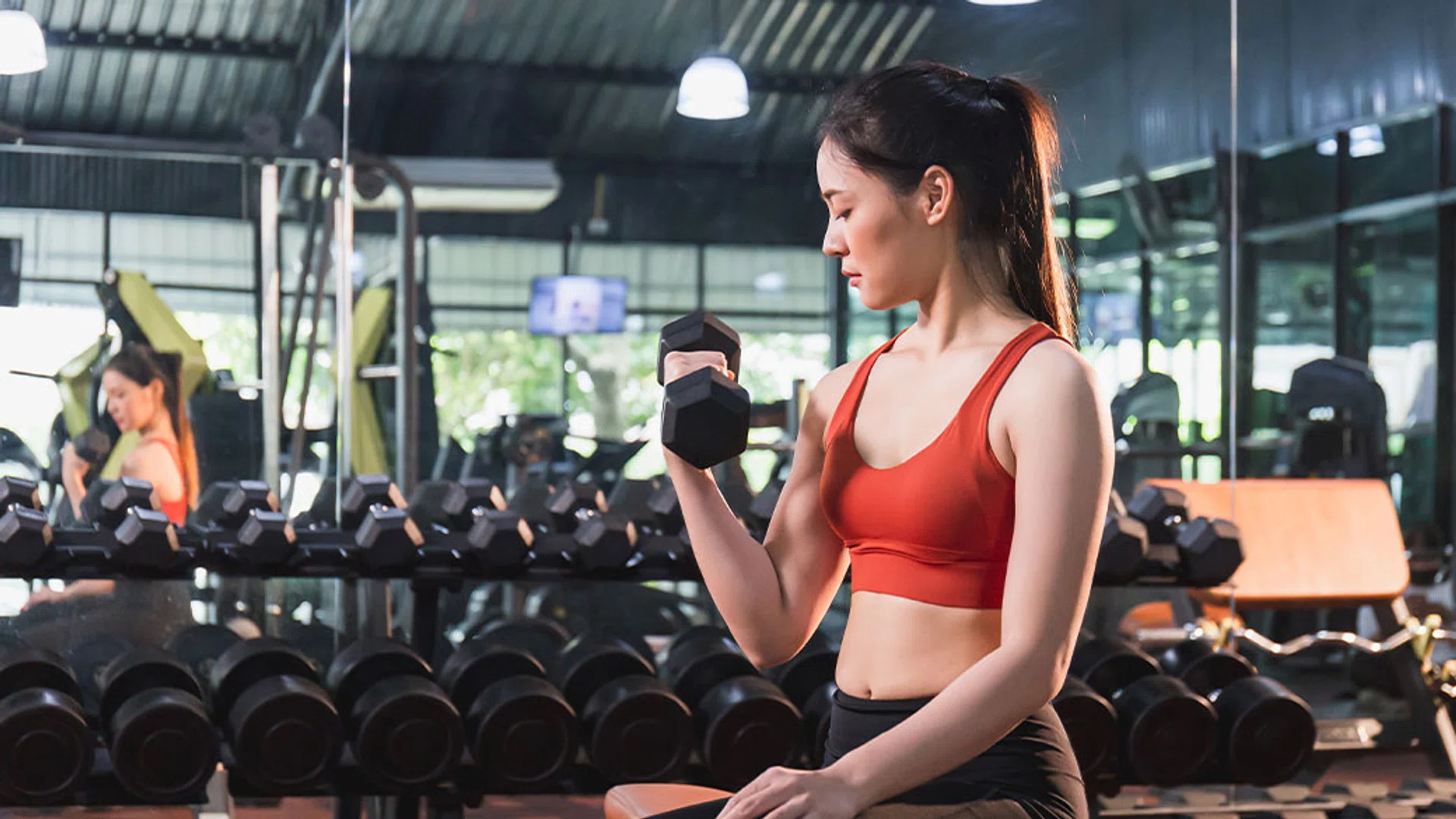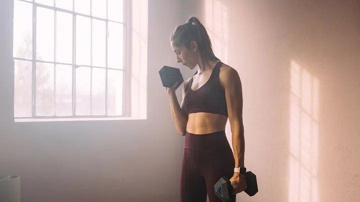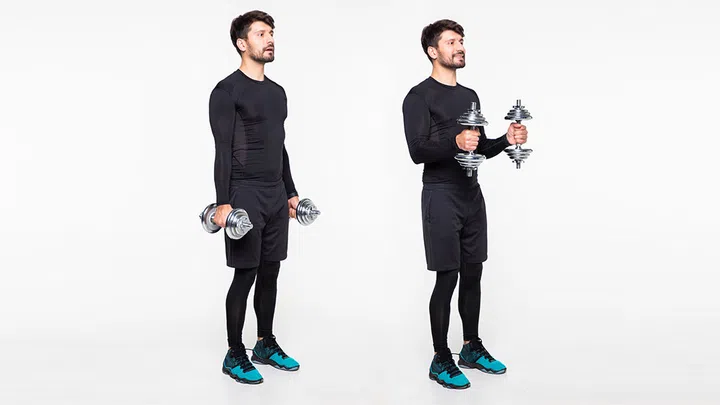 All you need to do is grab a dumbbell in each hand, keep your elbows close to your body, and curl those weights up towards your shoulders. Focus on descending slowly (the eccentric phase), while also keeping the ascending phase (the concentric phase) controlled. Increasing the time under the tension can lead to greater muscle growth.