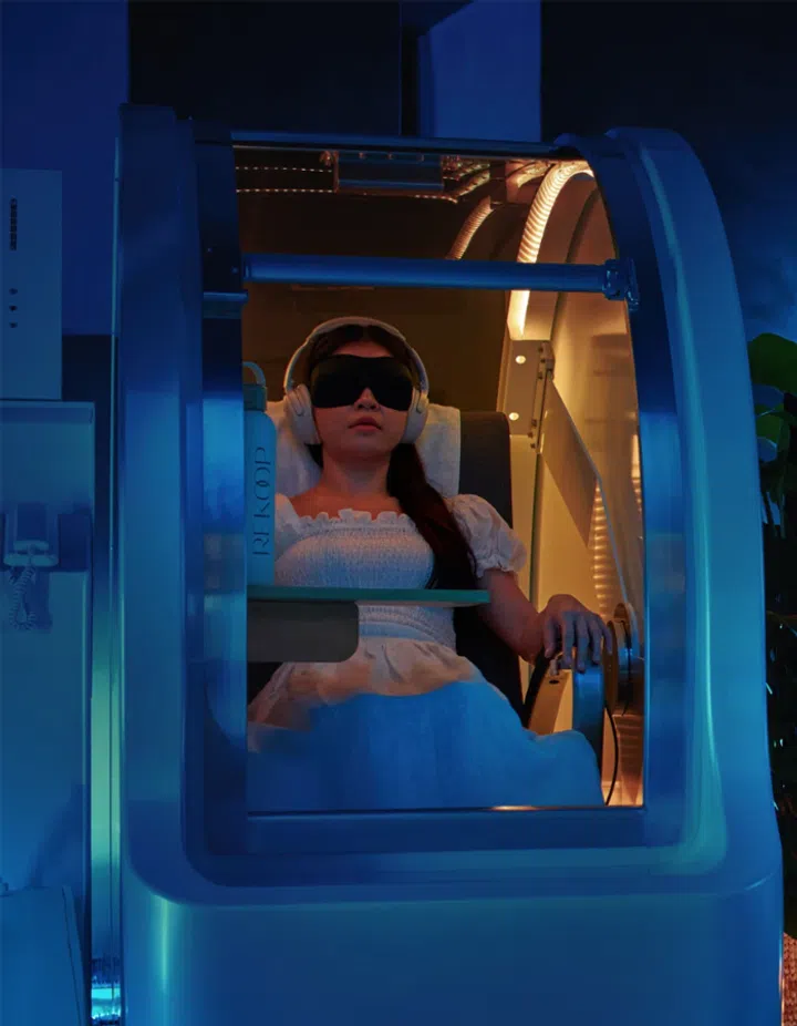 Rekoop’s calming pastel tones and curved interior details create a serene, cocoon-like retreat.