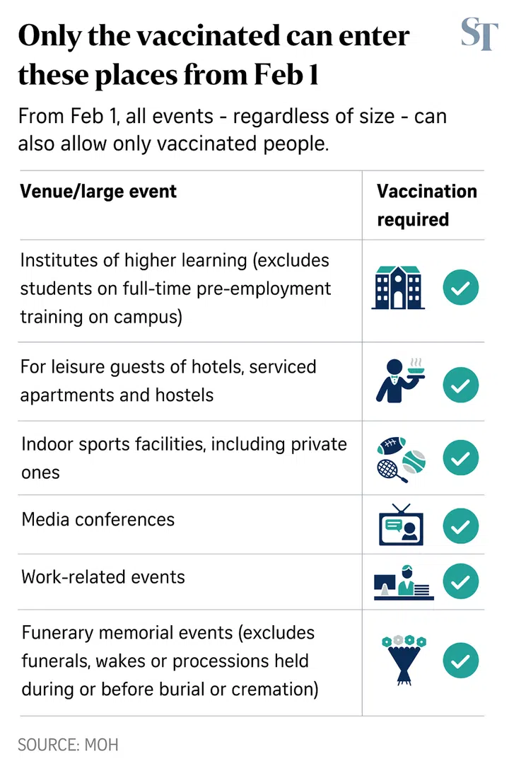 From Feb 1, vaccination-differentiated safe management measures (VDS) will cover all indoor sports facilities and institutes of higher learning, as well as apply to leisure guests in hotels, hostels and serviced apartments.
