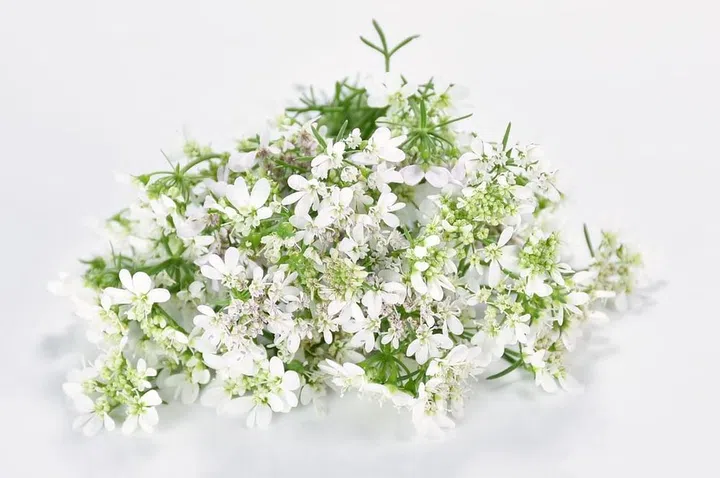 Coriander flowers have a particularly herbal taste, especially when brewed as tea, but they lend a cooling effect to spicy foods, which can prevent “heatiness”.