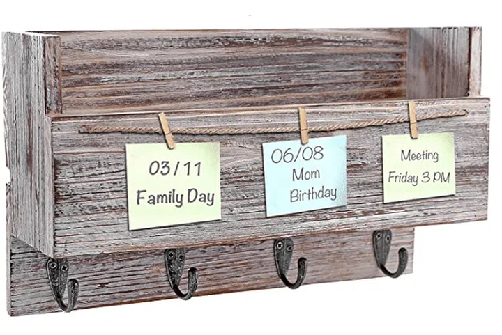 If you’re looking for something that’s a little more farmhouse, this lightweight yet sturdy organiser’s just the thing. A torched wood finish and four vintage key hooks lend rusticity to the piece, while the generous holder provides enough room for even small packages.