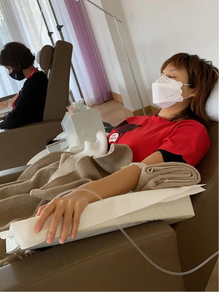 Wearing a mask is recommended in the medical area, but I just love how I can sleep like a baby during my IV infusion. Credit: Michelle Varinata