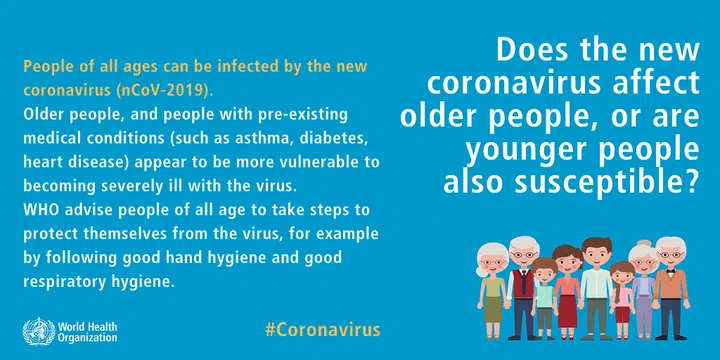 People of all ages can be infected by the coronavirus. Older people and people with pre-existing medical conditions (such as asthma, diabetes or heart disease) appear to be more vulnerable to becoming severely ill with the virus.