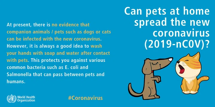 At present, there is no evidence that companion animals/pets such as dogs or cats can be infected with the coronavirus. However, it is always a good idea to wash your hands with soap and water after contact with pets. This protects you against various common bacteria such as E.coli and salmonella that can pass between pets and humans.