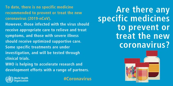 However, those infected with the virus should receive appropriate care to relieve and treat symptoms, and those with severe illness should receive optimised supportive care. Some specific treatments are under investigation, and will be tested through clinical trials. The WHO is helping to accelerate research and development efforts with a range or partners.