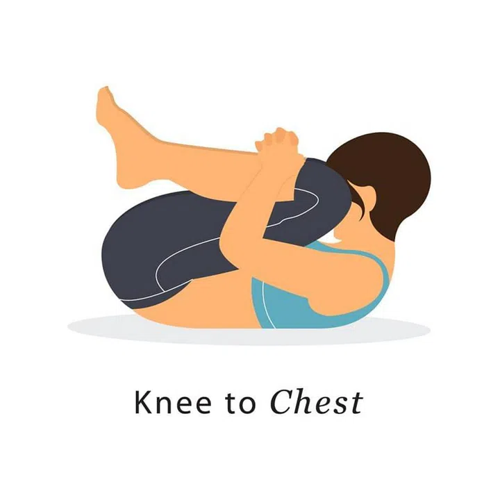 With your back on your mat, take both of your knees and hold them together with your hands. For a further stretch, make sure you feel a slight strain in your thighs.