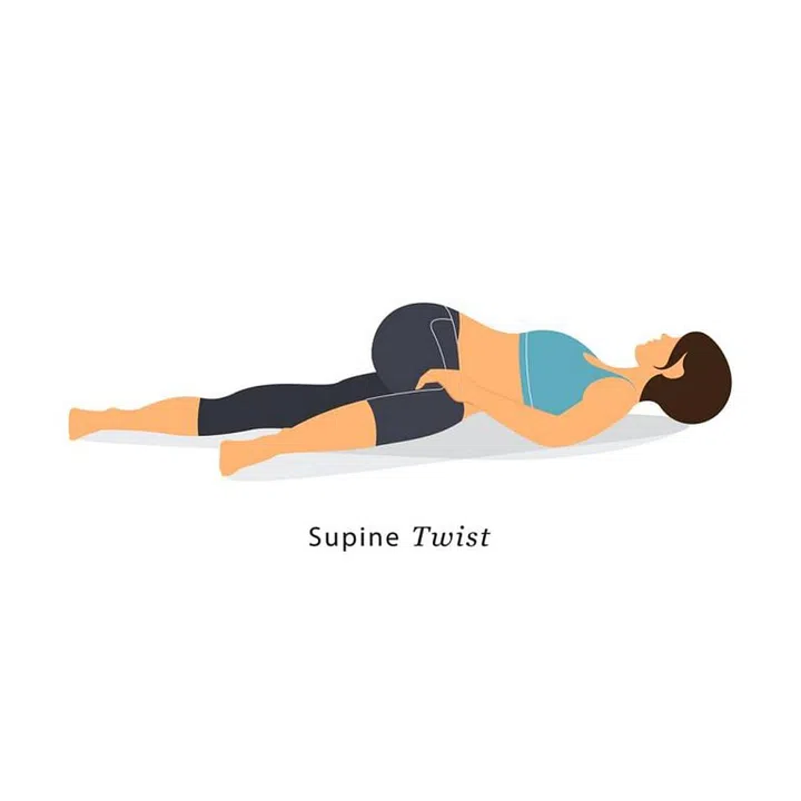 Lie with your back on the mat, arms spread out. Then, take one knee and stretch it 90 degrees to the opposite side, with one hand ensuring the leg stays down. Repeat for the other leg as well.