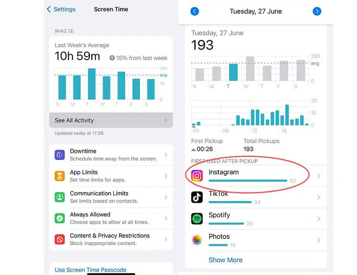 Pull out your phone, and under ‘Settings’, go to ‘Screen Time’ to see all your activity. Under the ‘First Used After Pickup’, have a look at the number of times you’ve opened the apps on your phone. Doing so allows you to have an insight on how often you wake your devices and which apps you use first after waking them. If you’re heavily reliant on social media, you’ll notice that most of these apps will be at the top of your list. For someone like me, whose work revolves around all things digital, you can definitely tell that I spend most of my time scrolling through apps like TikTok and Instagram.